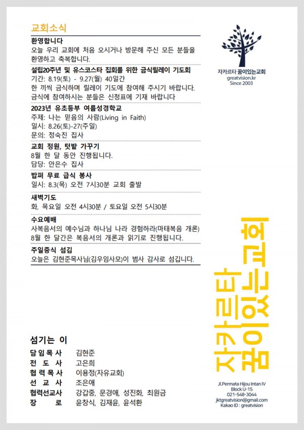 [교회소식] 2023년 07월 30일 주일예배 (주보)